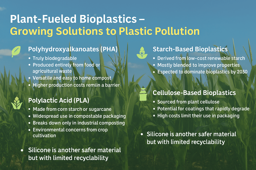- PLA: Bio-based but only degrades in industrial composters; crop-based feedstock raises food security concerns