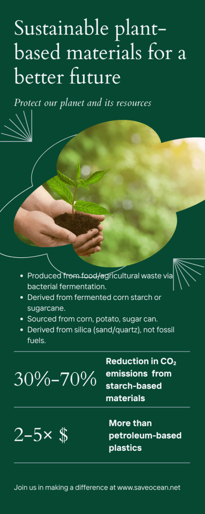 - Starch-Based: Reduces CO₂ emissions by 30–70%, uses plant waste, but cost remains a barrier.
