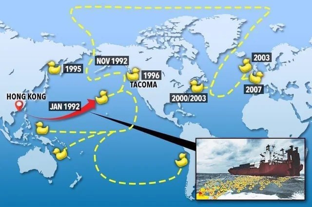 Unlike most bath toys, they didn’t have holes, so they never filled with water and could drift for years. Many ducks and beavers even bleached white in the sun, making them easier to spot. Wikipedia