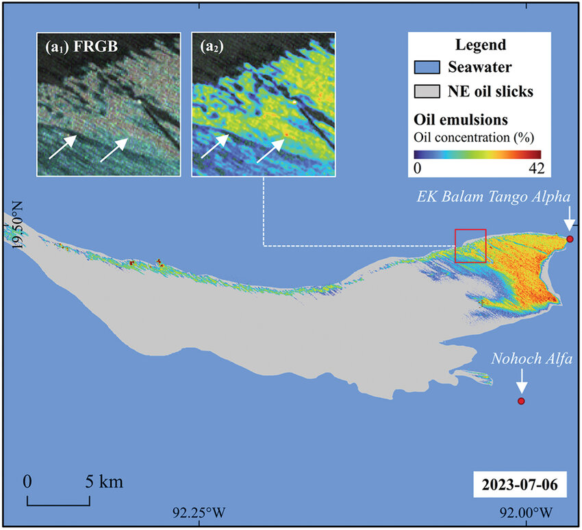 Multi-sensor assessment of accidental oil spills in the Bay of Campeche (2025). The Bay of Campeche in the southern Gulf of Mexico is abundant with oil reservoirs and is also full of oil platforms and oil seeps. Accidental oil spills occasionally occur, as was the case with the most recent one linked to an explosion on the Nohoch Alfa platform on 7 July 2023, which was captured by multi-sensor satellite imagery (including radar, optical, and thermal data).