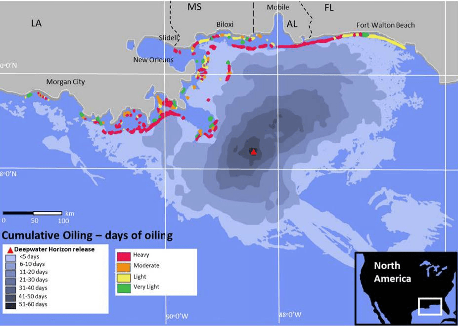 Long-term ecological impacts from oil spills: comparison of Exxon ValdezHebei Spirit and Deepwater Horizon (2020). Each of the three spills differed in magnitude and duration of oil released, environmental conditions, ecological communities, response and clean up measures, and ecological recovery.